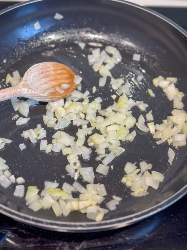 - Verwarm een hapjespan op middelhoog vuur en voeg een beetje olie toe. Voeg de gesnipperde ui en knoflook toe en bak glazig. Dan gaat het vegetarische gehakt erbij en bak deze in een paar minuten rondom bruin en gaar.