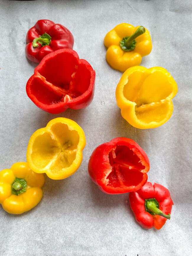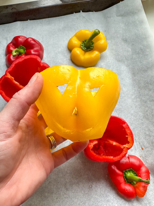 - Snijd het de bovenkant (met steel) van de paprika’s en verwijder de zaadlijst. Snijd voorzichtig met een scherp mes ogen, neus en griezelig mondje uit de paprika’s. Zet de paprika’s daarna rechtop op de bakplaat. Leg de kapjes (met steel) er ook bij.