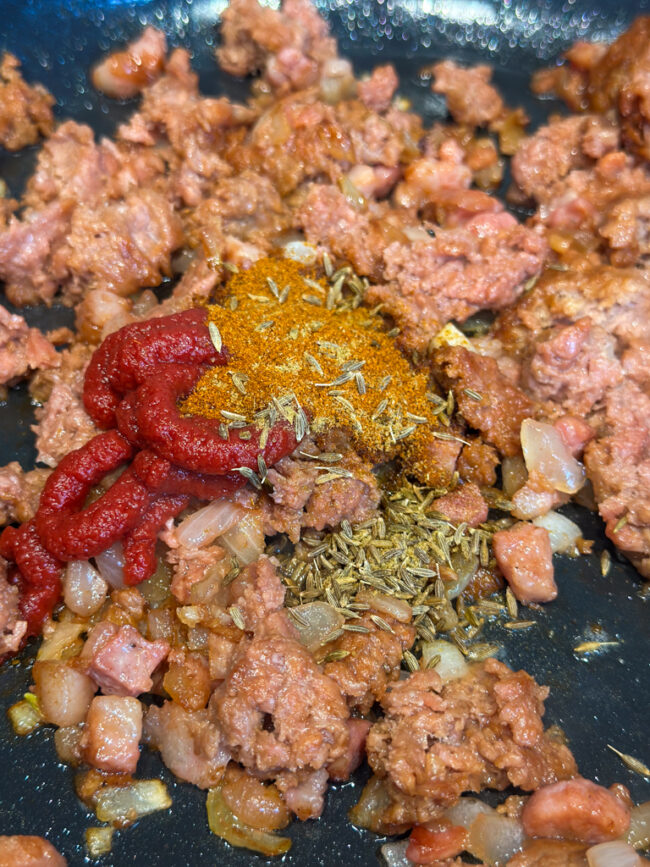 - Voeg de Mexicana Mix van mais, doperwt en paprika toe en breng het geheel op smaak met de tomatenpuree, paprikapoeder, komijn, peper en zout. Blijf goed doorroeren tot alles goed bedekt is.