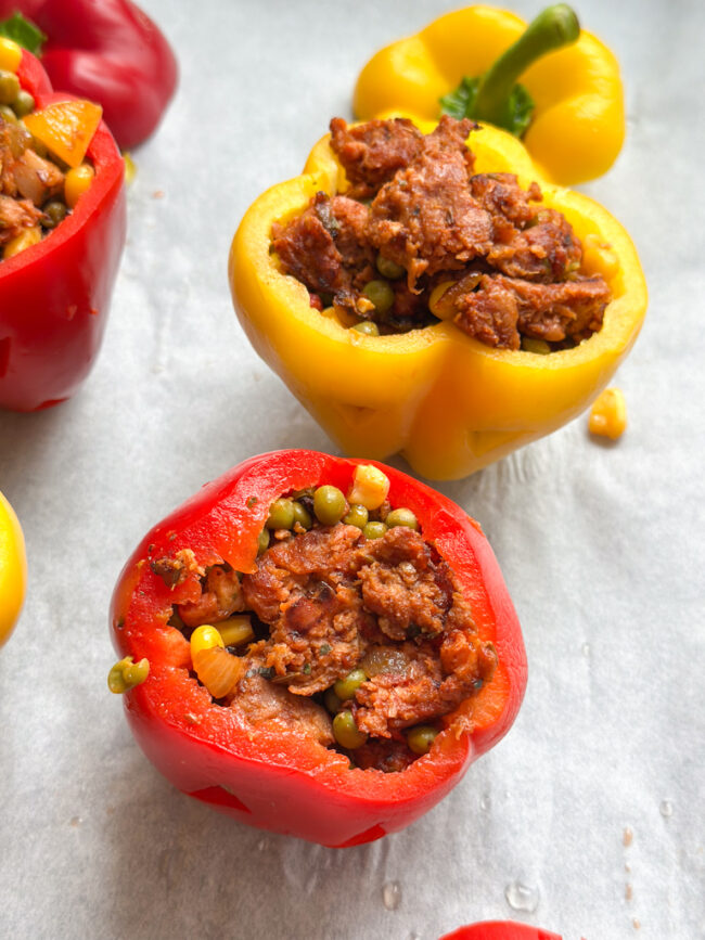 Dit recept is een lekker hartige gerecht dat hoort bij een avondje halloween vieren. Deze griezelige gevulde paprika’s voor halloween zijn gevuld met quinoa, vegetarisch gehakt en nog meer groenten. Een heerlijke maaltijd voor een avondje feest of zelfs trick or treat!
