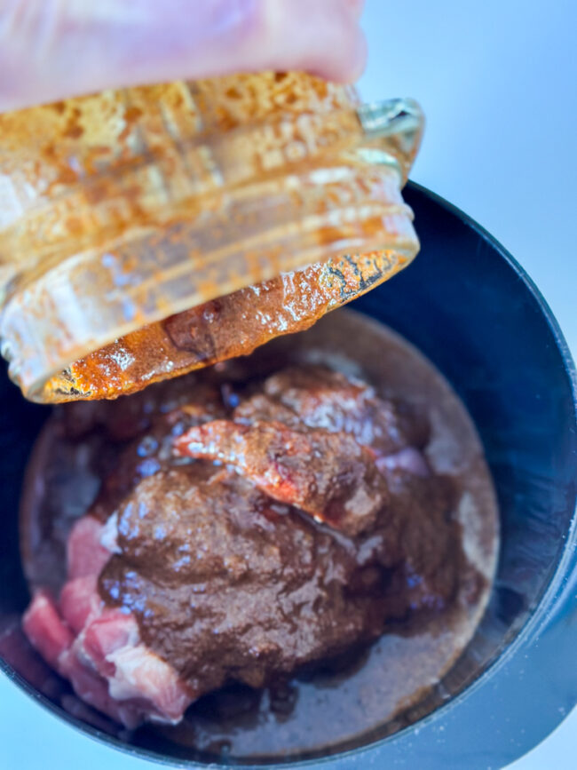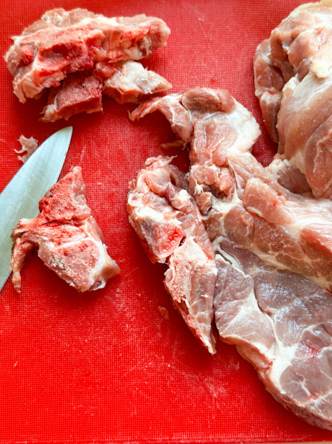 - Snijd het bot van de schouderkarbonades en stop het vlees in de marinade. Schep om en laat daarna minimaal 1 uur afgedekt marineren in de koelkast. (een hele nacht kan ook).