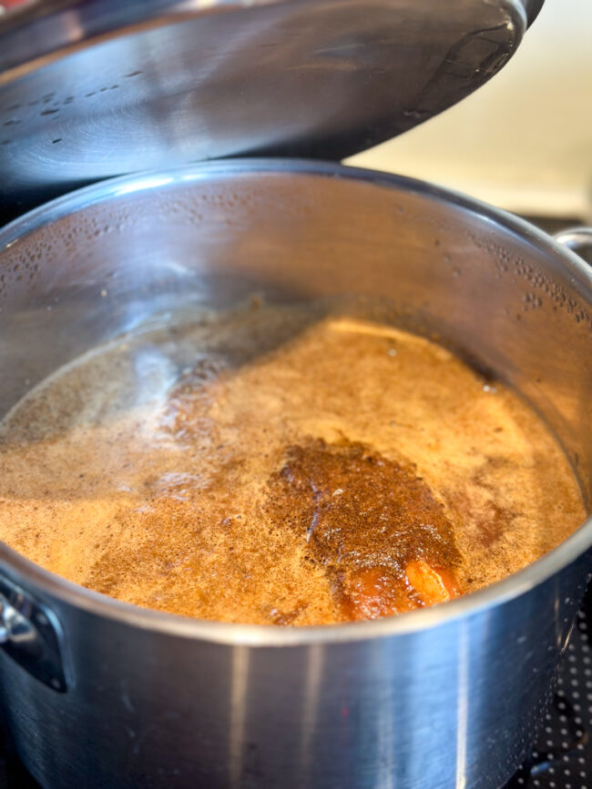 - Schenk ondertussen 150 – 200 ml van het kookvocht van het vlees bij de saus. Doe dit in delen zodat je tussentijds de dikte van de saus kunt bepalen.