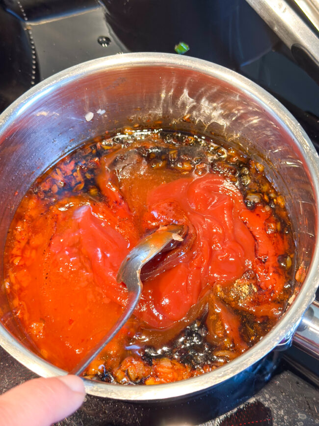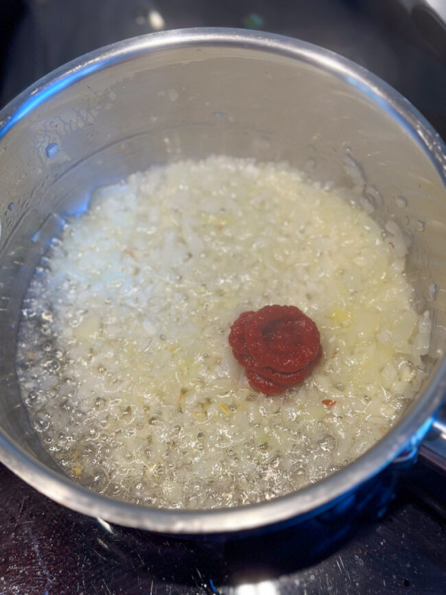 - Ondertussen ga je de saus maken: verhit een scheutje zonnebloemolie in een steelpannetje op middelhoog vuur. Fruit hierin de ui en en knoflook gedurende 2-3 minuten. Voeg dan de tomatenpuree toe en bak al omscheppende kort mee.