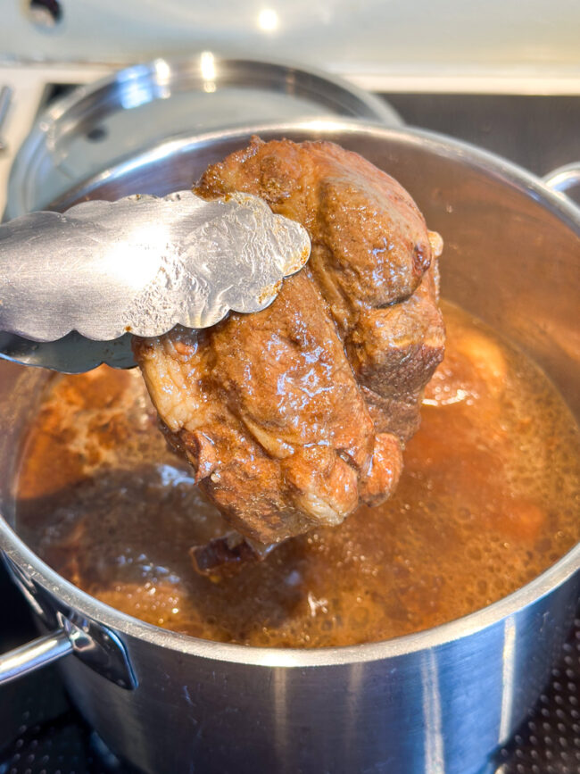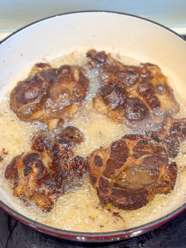 - Haal de vlees uit de kookpan en dep droog met keukenpapier. Verwarm een ruime (koeken)pan en voeg een flinke laag zonnebloemolie toe. Bak het vlees hier in enkele minuten krokant.