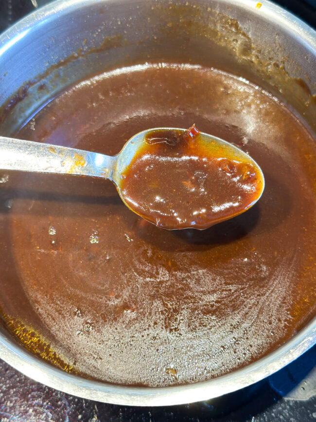 - Voeg het vijfkruidenpoeder, gemberpoeder, ketjap manis, sambal oelek, ketchup en chilisaus toe. Roer goed door elkaar en laat de saus sudderen tot het vlees klaar is.