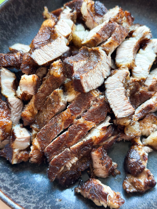 - Tot slot haal je het vlees uit de olie, snijd het overlangs in reepjes (van 1 cm). Plaats het vlees in een serveerschaal en schenk de hete zoetzure saus er overheen. Serveer de babi pangang met ringetjes van de bosuien.