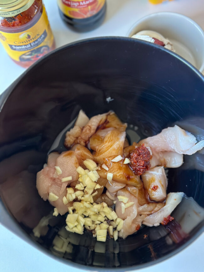 - Marineer als eerste de stukken kipfilet samen met de knoflook, een flinke scheut ketjap en 1-2 theelepels sambal naar wens. Roer goed door, breng op smaak met zout & peper en laat minstens 20 minuten afgedekt marineren.