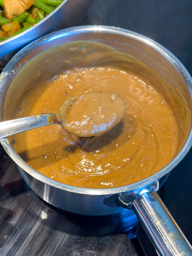 Bewaar deze foto op een van jouw Pinterest borden. Zo kun je hem altijd raadplegen als je aan de slag wilt gaan met maken van deze kip met boontjes en pindasaus.