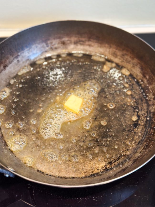 3. Smelt wat roomboter in een koekenpan(netje) en schep in delen hoopjes van eimengsel in de pan. Druk een beetje glad met de spatel zodat alles evenredig klaar is.  Bak aan weerszijden goudbruin en schep uit de pan op een bord.